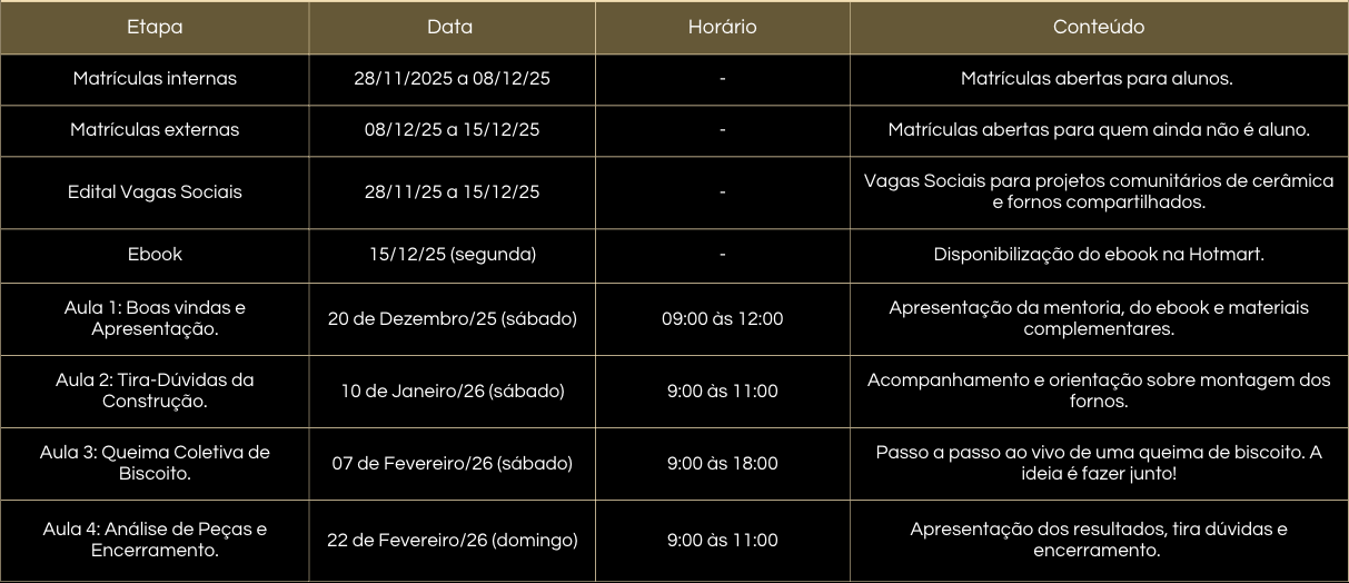 Com o objetivo de incentivar práticas cerâmicas em contextos comunitários, periféricos e coletivos, teremos 02 vagas sociais integrais (100% de isenção) para essa edição da mentoria Forno de Latão: da construção às queimas cerâmicas.