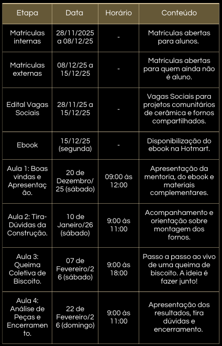 busca um acompanhamento próximo e personalizado, com orientação direta da Amanda, garantindo que saia da mentoria com seu forno construído e conhecimento para conduzir diferentes tipos de queima.